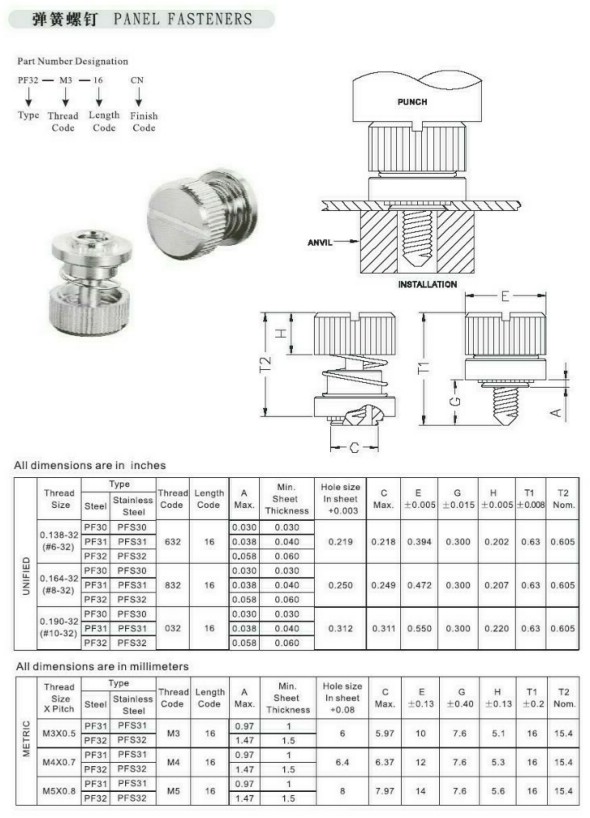 材質:碳鋼螺釘,碳鋼壓鉚套,鋁手擰套之組合;不銹鋼螺釘,不銹鋼壓鉚套,鋁手擰套之組合